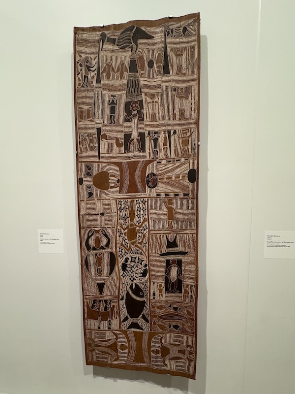 Ik bezocht ook de Art Gallery of New South Wales (de Sydney-variant op het Rijksmuseum), waar een tentoonstelling te zien was van deels nog levende Aboriginals uit Arnhem Land, een van de meest noordelijke regio’s van Australië (bij Darwin). De gids gaf veel informatie over de manier waarop de kunstenaars werken: platgeslagen boomschors is vaak het ‘doek’, en de verf bestaat uit aardse materialen die meestal in punten of strepen worden aangebracht. Fascinerend. Zo leer je pas een volk kennen waarvan ik tot vorig jaar nog maar weinig wist.